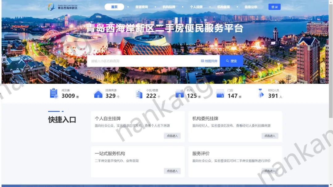 青岛西海岸新区二手房便民服务平台由管委区政府主导、区住房和城乡建设局牵头,由上海南康科技有限公司负责开发建设完成。