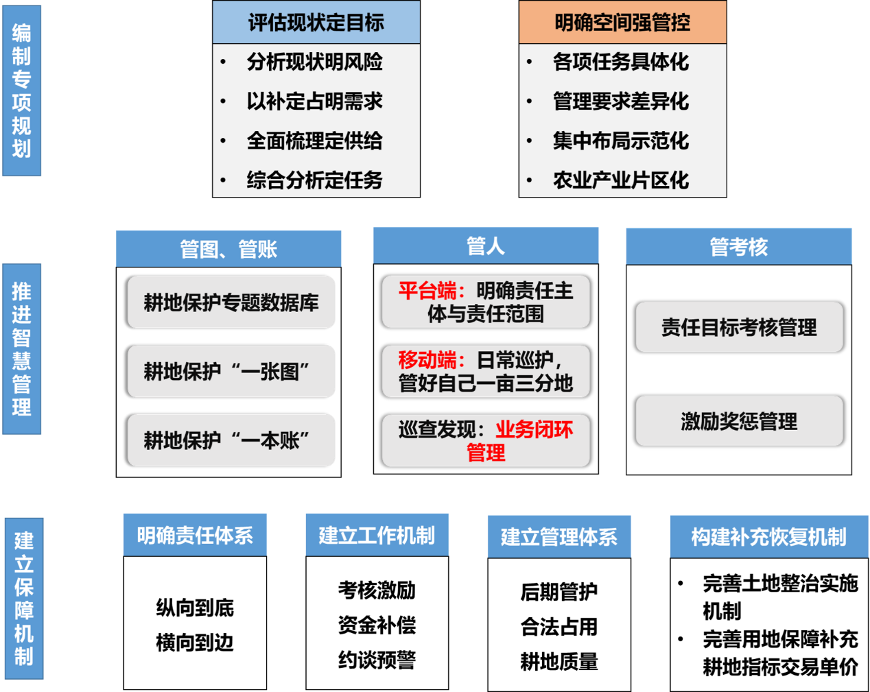 以整体策划为前提,协同联动“规划编制、实施机制、信息化”等措施,提供全过程的耕地保护解决方案,打穿耕地保护治理过程中的各项堵点、难点