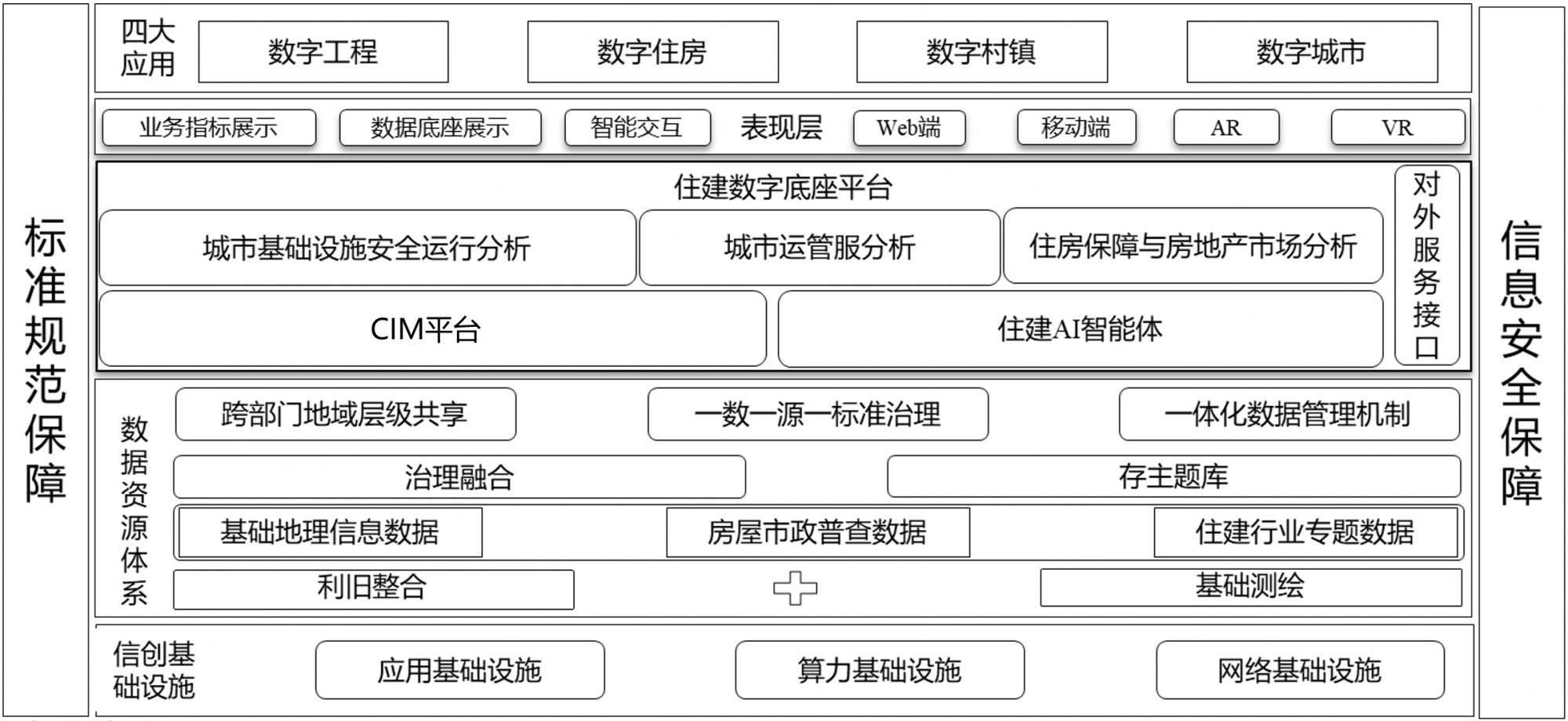 系统以"大系统共治、大数据慧治、大服务惠民"为核心理念,在数字住建基础设施之上,基于数据采集、汇聚、融合、治理、存储的数据全流程处理,打造一体化数据资源体系;建设住建数字底座平台,实现数据资源汇聚、打造空间数字底座、实现三维可视化渲染,对外实现数据服务共享更新。在横向层面,建设住建AI智能体,基于多模态AI模型,实现AI智能交互,助力城市运行监管,形成预测研判分析模型,支撑仿真决策,为城市基础设施运行监测、运管服、住房保障与房地产市场分析等应用提供专项分析能力。